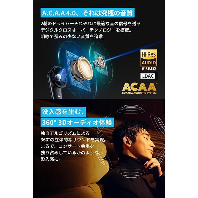 A.C.A.A 4.0による究極の音質:低音域用と中高音域用のアップグレードされた2基ドライバーを搭載。それぞれのドライバーに最適な音の信号を送る技術により、高音から低音まで明瞭で歪みの少ない音質を追求しました。