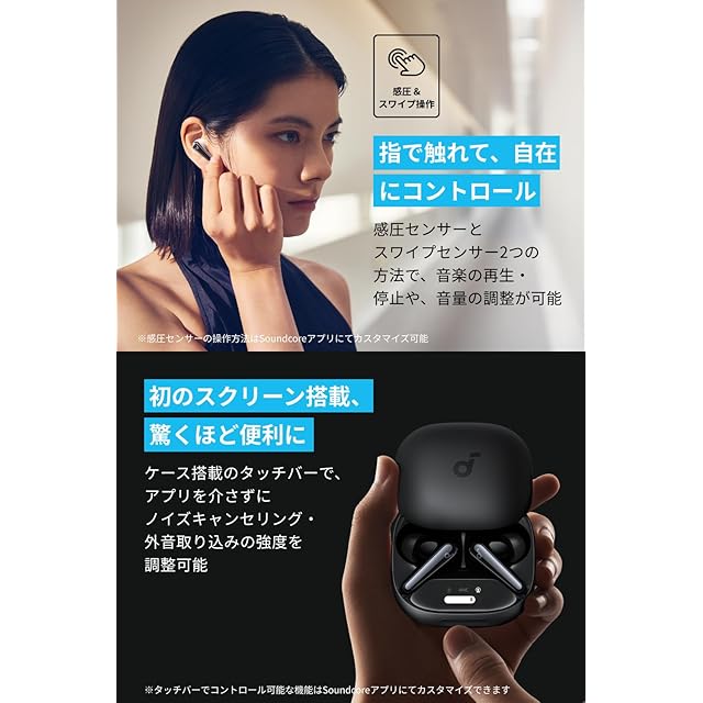 直感的な操作:イヤホン本体に感圧&スワイプセンサーを実装。またケースに搭載されたタッチバーとスクリーンで各種モード設定が可能に。アプリを介さず直感的に操作いただけます。