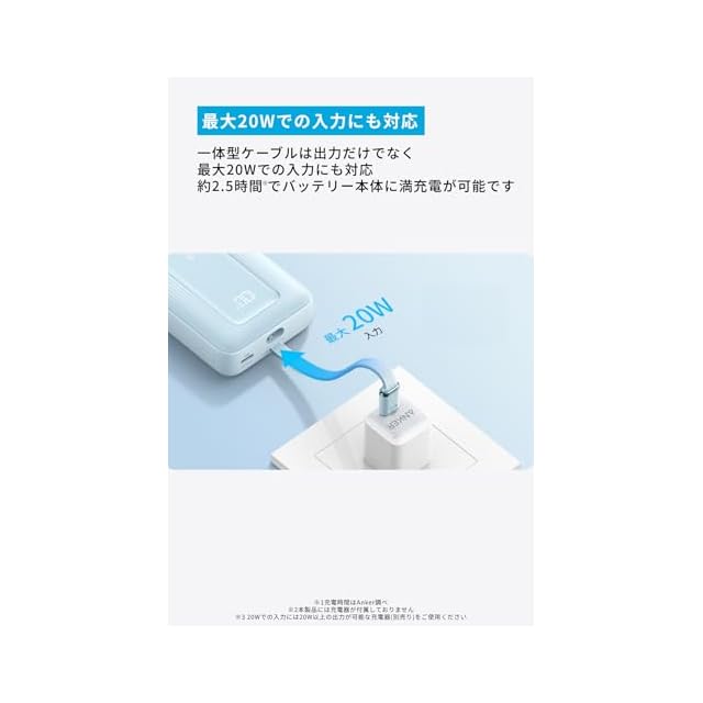 最大20Wでの入力にも対応:一体型ケーブルは出力だけでなく、最大20Wでの入力にも対応可能です。約2.5時間 でバッテリー本体に満充電が可能です。 ※20W出力のUSB急速充電器を使用して充電した場合(Anker調べ)