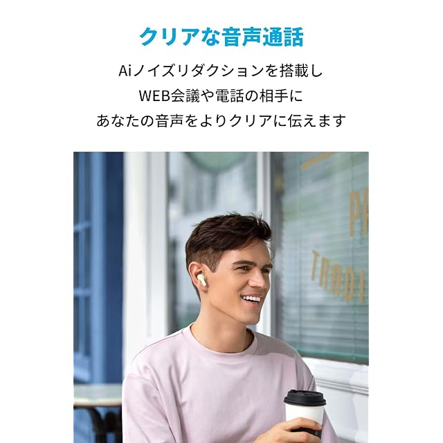 Soundcore | Hear It. Feel It.<br> 心地良く、等身大に音楽を楽しみたいあなたへ贈る、Ankerのオーディオブランド<br><br>製品の仕様<br> 再生可能時間:最大8時間(イヤホン本体のみ) / 最大32時間(充電ケース使用時)<br> 充電端子:USB Type-C<br> 重さ:約47g(充電ケース含む) / 約4.4g(イヤホン本体 片耳)<br> 防水規格:IPX5<br> 通信方式:Bluetooth 5.2<br> Bluetoothプロファイル:A2DP, AVRCP, HFP, HSP<br> 対応コーデック:SBC / AAC<br><br>注意<br><br>・本製品はSoundcoreアプリ非対応です。<br>・お使いの機器とイヤホンを接続する前に、必ずイヤホンのシールを剥がしてからケースに戻して電源を入れてください。<br>・片耳使用時はイコライザー設定は切り替えできません。<br><br>パワフルなサウンド<br>3層構造の大型の10mmドライバーを搭載。コンパクトな小型モデルながら、迫力ある低音を実現します。<br><br>好みのチューニングが選べる<br>バランスの取れた通常モードに加え、低音を増幅させた低音モード、音声をクリアに強調するボーカルモードの3つのイコライザーモードからお好みに合わせてお選びいただけます。<br>※イコライザー設定は、イヤホン本体(右耳)を3回タップして切り替え可能です。<br><br>軽くコンパクトなサイズ感<br>イヤホンの重さは約4.4g。どんなに長時間装着していても疲れることはありません。ケースもコンパクトなサイズで小さなポケットやカバンの中にもすっきりと収まります。<br><br>最大32時間の長時間再生<br>イヤホン本体が満充電の状態で、最大8時間の音楽再生が可能です。また付属の充電ケースを合わせて使えば、最大32時間の連続再生が可能です。また10分間の充電で約1時間の音楽再生が可能です。<br>※再生可能時間は、音量、再生する内容、使用環境によって異なります。<br><br>クリアな音声通話<br>AIノイズリダクション搭載。AIがあなたの音声と周辺のノイズを認識し、ノイズを除去しながら人の声を大きく伝送することで、通話相手はあなたの音声をよりクリアに聞くことが可能です。<br>※この機能は通話時のノイズを除去する機能であり、音楽を聴くときに周囲の雑音を除去するものではありません。<br><br>片耳でもお楽しみいただけます<br>左右のイヤホンの単独使用と両耳での使用を簡単に切り替えることができます。<br>※片耳使用時は、もう片方のイヤホンを充電ケースに戻し、ケースの蓋を閉じてください。<br>※片耳使用時は、イコライザー設定は切り替えできません。<br><br>1ステップで簡単接続<br>充電ケースを開けると自動的にペアリングモードになり、簡単に接続できます。<br><br>安定した接続<br>Bluetooth 5.2に対応し、音飛びを極限まで抑え、安定した接続で音楽をお楽しみいただけます。