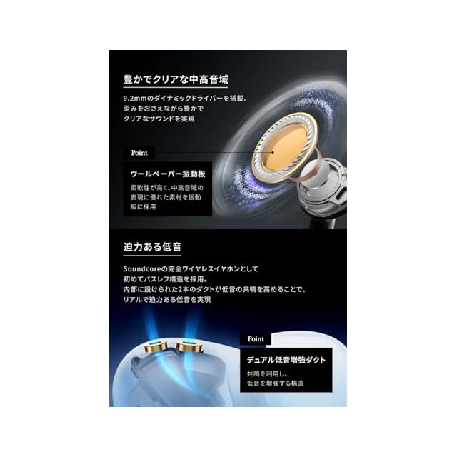 迫力ある低音:Soundcoreの完全ワイヤレスイヤホンとして初めてバスレフ構造を採用。内部に設けられた2本のダクトが低音の共鳴を高めることで、リアルで迫力ある低音を実現。