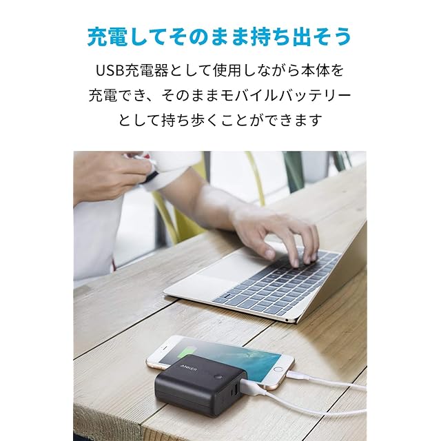 充電してそのまま持ち出そう:USB充電器として使用しながらAnker PowerCore Fusion本体を充電でき、そのままモバイルバッテリーとして持ち歩くことができます。折りたたみ式プラグを採用しているので持ち運びに便利です。(USB充電器としての使用時は、まずお使いの機器を充電し、その後Anker PowerCore Fusion本体の充電を開始します)