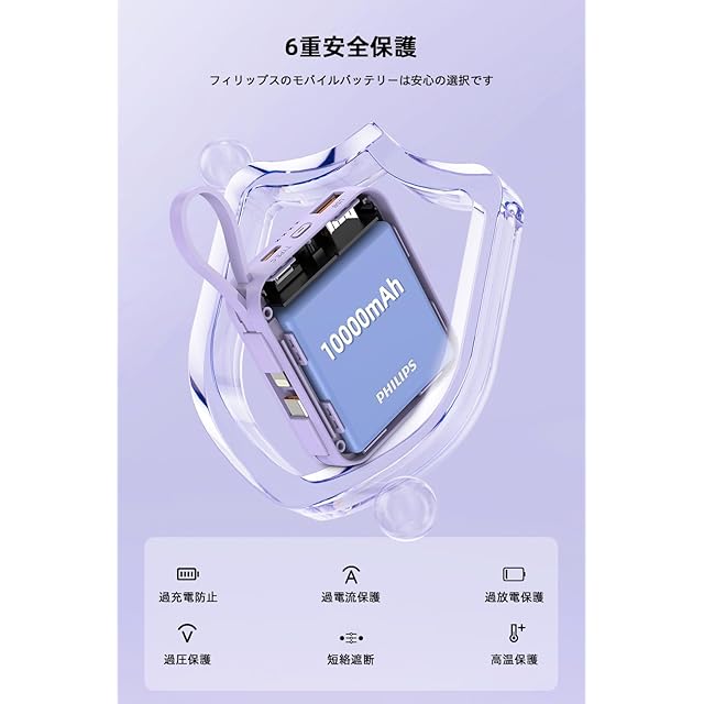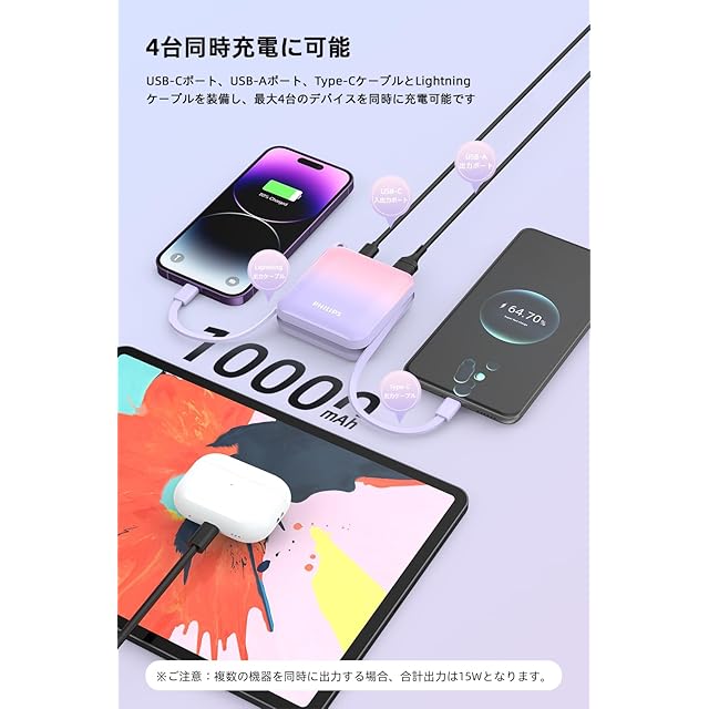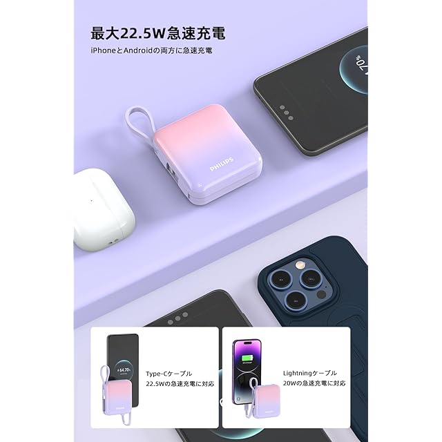 商品名:Philips (フィリップス) モバイルバッテリー 10000mAh 大容量 小型 携帯充電器 Lightning type-c ケーブル内蔵 22.5W タイプc ライトニング 4台同時充電 スマホ 持ち運び iPhone 16 / 15 Android iPad 各種機器対応 PSE認証済 (ピンク紫)