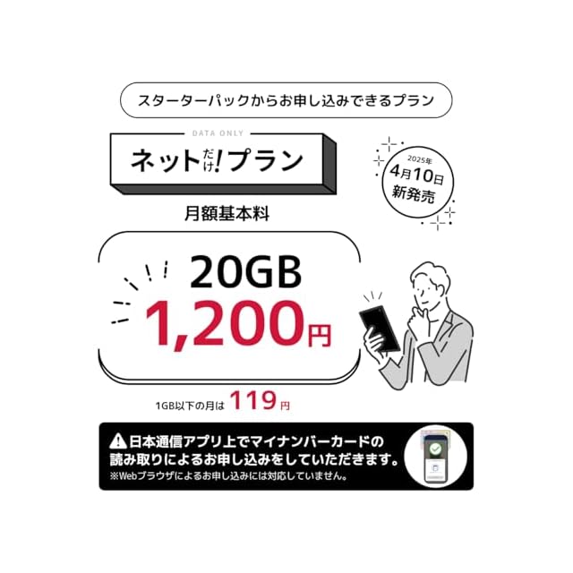 データ通信専用「ネットだけプラン」のお申込みに対応。日本通信アプリ、マイナンバーカードが必要です。