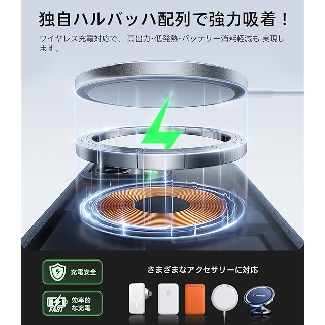 【本当か!特許を取得したマグネット!これこそ驚異的な安定性だ!】36個の高性能N52磁石を採用し、純正MagSafeと同素材で作られています。さらに独自特許のHalbach Array技術により磁石の配置と磁力線の方向を最適化し、純正を超える吸着力を実現。スマホをしっかり固定するだけでなく、充電効率も大幅に向上します。対応機種:For iPhone 17 ケース