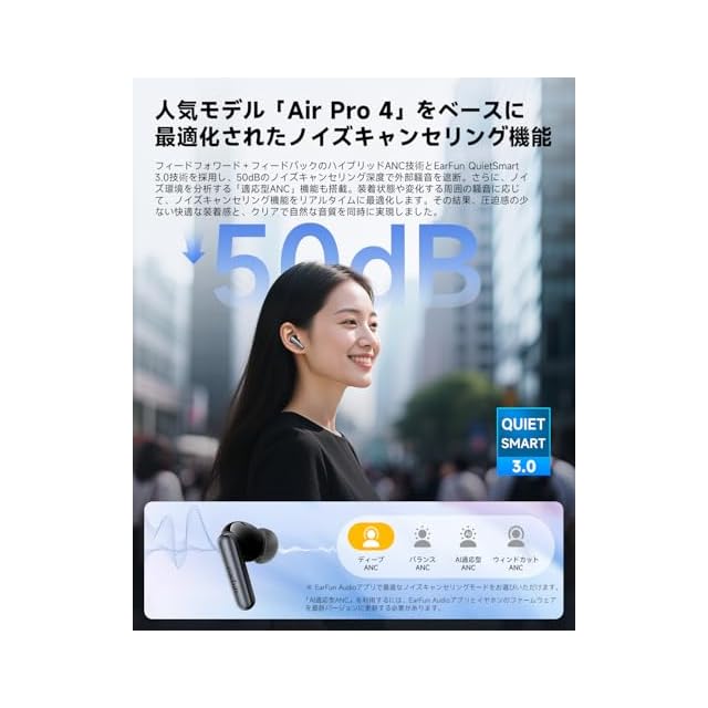 【人気モデルのノイズキャンセリング特化型】人気モデル『EarFun Air Pro 4』をさらに進化させた『EarFun Air Pro 4i』は、ハイブリッドANCと独自のANC技術『QuietSmart 3.0』を搭載。最大50dBのノイズ低減能力で、環境雑音を効果的にカット。周囲の状況や装着状態に応じてノイズ低減の強さを自動調整する『適応型ANC』により、圧迫感の少ない自然な聴こえを実現しました。さらに、各周波数帯ごとに最適化されたフィルターや、鼓膜に近い位置に配置されたフィードバックマイクで、ノイズ検知・除去の精度を向上。改良された通気孔設計で気圧バランスを安定させ、遮音性能を持続させます。どんなシーンでも、クリアな音と快適な装着感を約束する、ノイズキャンセリングの新基準です。注:ノイズキャンセリング効果は装着時の密着度によって異なります。最大限のノイズキャンセリング効果を発揮するために、イヤホンが耳にしっかりと密着していることを確認してください。