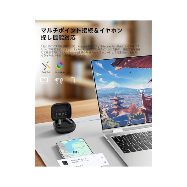 【最大40時間連続再生 & マルチポイント接続&イヤホン追跡機能対応】イヤホン単体で最大9.5時間、充電ケースと合わせればトータル40時間まで音楽を楽しめます。忙しい朝でもわずか10分の充電で2時間再生できる、急速充電に対応。さらにワイヤレス充電にも対応しているので、置くだけで簡単に充電が完了します。マルチポイント接続もサポート。2台のデバイスを同時接続できます。AndroidデバイスはGoogle Fast Pairによる高速ペアリングが可能です。さらに、EarFun Audioアプリの「イヤホンを探す」機能で音を鳴らして探せるだけでなく、Android最新のFind Hubトラッカーによる位置追跡にも対応。もうイヤホンを失くす心配はありません!