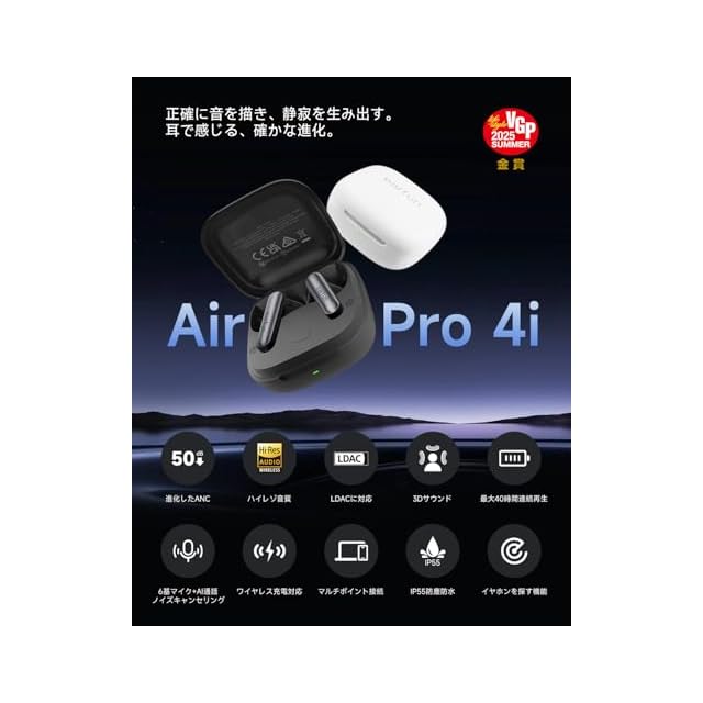 商品名:【VGP 2025 SUMMER 金賞】EarFun Air Pro 4i ワイヤレスイヤホン Bluetooth 5.4/50dB低減ハイブリッドANC/ハイレゾ LDAC対応/ 3Dサウンド/ 11mmチタン複合振動膜ドライバー/ 40時間連続再生/ 6マイクAI 通話/ワイヤレス充電/ IP55防塵防水/ マルチポイント接続【PSE認証済み】(ブラック)