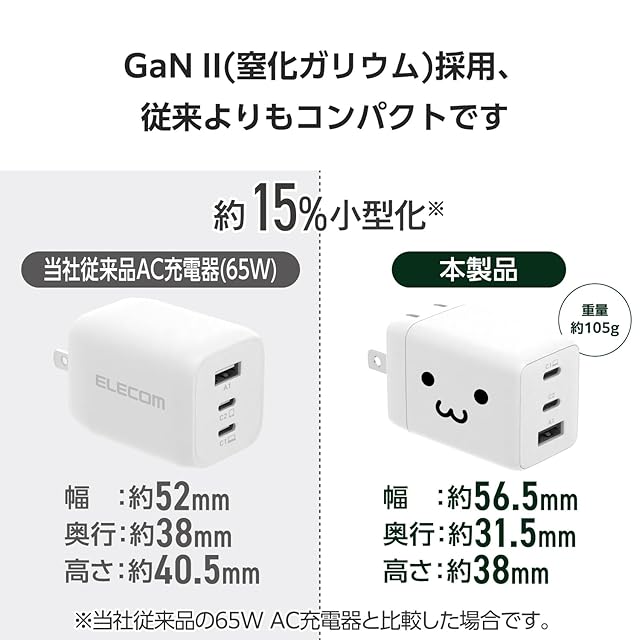 商品名:エレコム 充電器 合計65W 3ポート Type-C USB-A USB PD対応 スイング式プラグ採用 しろちゃん EC-AC10367WF