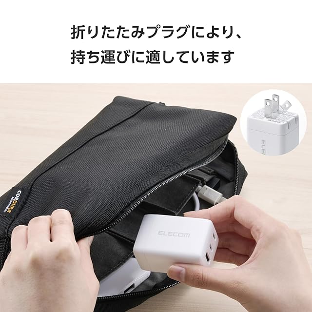 GaN II(窒化ガリウム)を採用し、高出力ながらコンパクトサイズを実現。プラグ部分も折り畳むことができるため、バッグの中でもスペースを取らず、ビジネスでの外出やリモートワーク、出張、旅行など持ち運びにも便利です。