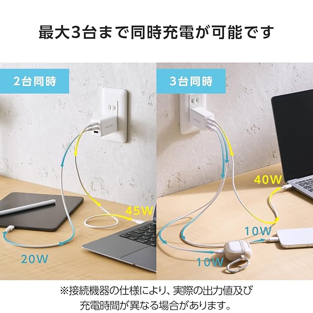 2ポート同時接続時は10W~45W、3ポート同時接続時は10W~40Wでの出力が可能。スマートフォンやタブレット、ワイヤレスイヤホン、電子タバコなどのデバイスを同時に充電できます。
