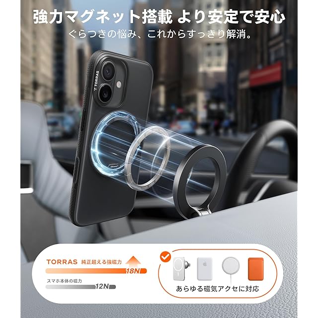 商品名:TORRAS iPhone 17 用ケース 【カチカチ・多機能360度回転スタンド】リング Ostand O3 Fitness MagSafe対応 米軍MIL規格耐衝撃 スタンド 指紋防止 黄変防止 カメラコントロールボタン付き ストラップホール 半透明 撮影/動画視聴/日常の記録 手のひらサイズの映像革命 ブラック