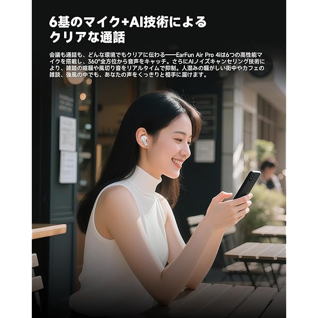 【6基のマイク+AI技術によるクリアな通話 & IP55防塵防水】会議中でも通話中でも、クリアに会話ができる――EarFun Air Pro 4iは6つの高性能マイクを搭載し、360°全方位から音声をキャッチ。AI技術で、環境ノイズを検知し、周囲の雜音を効果的に除去します。相手に声をしっかり届けるクリアな音声通話が可能。さらに、IPX55の防塵防水性能を備えており、不意の水濡れや運動中の発汗などにも安心して対応できます。注:充電ケースに防水機能はありません。