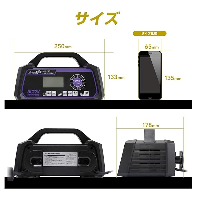 商品名:メルテック(meltec) 全自動パルスバッテリー充電器 (バイク~ミニバン/小型トラック/小型船舶) 12V専用 MeltecPlus 定格15A バッテリー診断機能付 維持充電(トリクル充電)方式 AGM/アイドリングストップ(ISS)車充電可能 長期3年MP-220