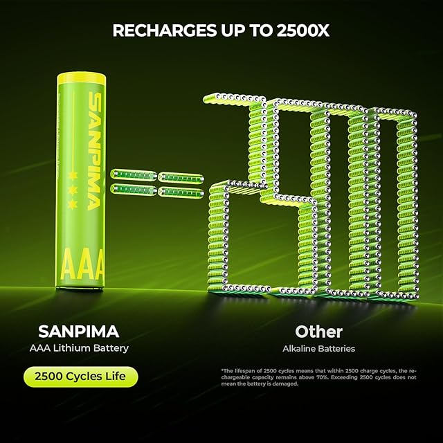 【2500回の長寿命サイクル】メモリ効果がなく、非常に低い自己放電率を持ち、充電式のAAリチウム電池は1600回以上の充電サイクルを持ち、大量のコストを節約できます。要するに、充電式のAAリチウム電池は、日常使いのために信頼性のある長持ちのエネルギー供給源です。
