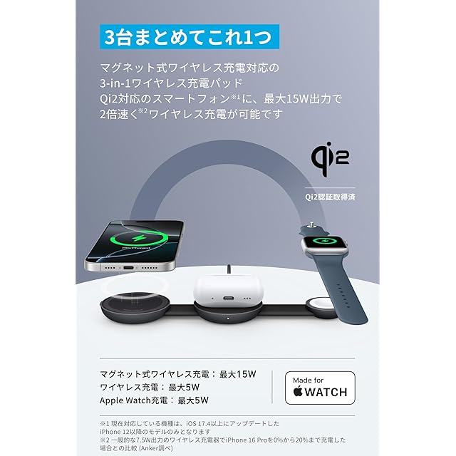 3台まとめてこれ1つ:マグネット式ワイヤレス充電対応の3-in-1ワイヤレス充電パッド。Qi2対応のiPhoneに、最大15W出力で2倍速くワイヤレス充電が可能です。