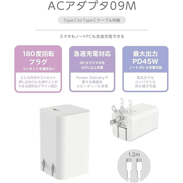 ■充電性能<br>出力45Wで、スマートフォンやノートPCを急速充電できます。<br>特にスマートフォンを30分で約50%以上充電可能です。<br>※この数値は、2025年4月時点でのiPhone16を0%から充電した場合に基づいています。<br><br>PowerDelivery(PD)に対応しており、様々な機器をスピーディーに充電できます。<br>PPS(ProgrammablePowerSupply)機能を搭載しており、接続された機器に最適な電力を供給することで、<br>より効率的かつ高速な充電を実現します。<br>スマートフォンだけでなく、タブレット端末、ノートPC、イヤホン、ゲーム機など、<br>幅広い機種に対応しています。<br><br>■デザインと携帯性<br>45W出力を維持しつつ、コンパクトな設計です。<br>シンプルでどんな空間にも馴染むデザインで、ライフスタイルやインテリアを選ばず、<br>使う人の「こうしたい」に寄り添うストレスフリーな充電器です。<br><br>■安全性・安心機能<br>ドコモあんしん・あんぜん設計が施されています。<br>ショート対策:万が一ショートした場合でも給電を抑え、発熱や発火を防ぎます。<br>通信影響対策:ノイズを抑えることで、スマートフォンの電波感度の劣化を抑制します。<br>温度保護機能:高温になった際には自動で給電をストップします。<br>異常検知機能:専用ICを搭載し、過電流や過電圧の異常を速やかに検知して、発熱や発火を防ぎます。<br><br>■安心サポート<br>ご注文日から12カ月以内に製品不具合が生じた場合は、<br>確認後、速やかに同一の新品と交換させていただきます。<br><br>アダプタ本体入力AC100V~240V50/60Hz1.5A(MAX)<br>アダプタ本体出力最大45W<br>(PDO)DC5.0V/3.0A、DC9.0V/3.0A、DC12.0V/3.0A、DC15.0V/3.0A、DC20.0V/2.25A<br>(PPS)DC5.0-16.0V/3.0ADC5.0-21.0V/2.25A<br>USBケーブルCtoC<br>(同梱品)ケーブル長1.2m<br>USBケーブルCtoC<br>(同梱品)コネクタUSBTypeC<br>同梱品<br>・ACアダプタ本体<br>・USBケーブル(Type-CtoType-C、1.2m)<br>・取扱説明書兼書