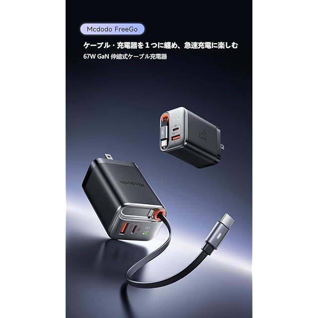 【67W GaN 伸縮式ケーブル充電器】:ケーブルと充電器が一体化したMcdodo FreeGoシリーズの67Wの自動巻き取り式ケーブル充電器で、急速充電をお楽しみください。リアルタイムで表示、充電出力。自動巻き取り式USB Type-Cケーブル。引っ張り出すだけですぐに使用できます。最新のGaNテクノロジーを採用しており、安全性がさらに高まります。3つの急速充電ポート、幅広い互換性。ノートパソコン・タブレット・スマートフォンなどデバイスを幅広い互換します。