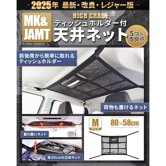 【MK&JAMT R7年改良モデル】車 天井ネット ルーフネット 車中泊 Mサイズ(80×58cm) ルーフボックス カーゴネット ラゲッジネット 普通サイズミニバン 日本語取説 書付