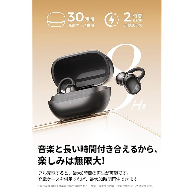 【単体8時間連続再生、急速充電対応】イヤホン本体で最大8時間(ダイナミックEQを有効にした場合は最大6時間)、充電ケースを含めると最大30時間の再生が可能です※。また急速充電に対応し、わずか10分の充電で2時間の再生が可能です。日常生活での使用はもちろん、長距離移動やアウトドアで利用するときにも、バッテリー残量の心配がありません。※これはSOUNDPEATS社内試験条件の試験結果に基づいたものです。再生時間は音楽再生時の時間であり、音量、再生内容、使用環境によって異なる場合があります。