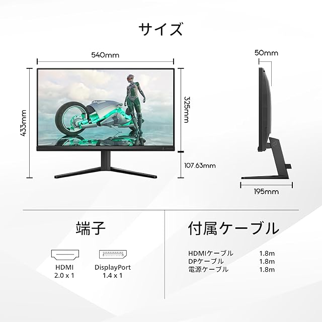 【付属品とケーブル】 DisplayPortケーブル(1.8m)、HDMIケーブル(1.8m)、電源ケーブル(1.8m)、クイックスタートガイド、書、ケーブル付属リスト、ベーススタンド、ベース支柱、VESAカバー。【本体サイズ(スタンドあり)(mm)】 433 (H) × 540(W) × 195 (D)、3.26kg。【安心サポート】 お買い上げより5年間無償修理(詳細は製品画像をチェック!)。