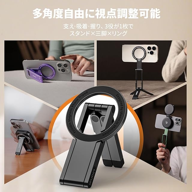 商品名:Ulanzi MA60 スマホ三脚 ミニ三脚 magsafeに対応 自撮り棒 スマホスタンド ミニ携帯スタンド 携帯リング スマホグリップ 薄型軽量 多機能角度調整可能 横置き/縦置き 折りたたみ式 両面マグネット式 アルミ製 持ち運び便利 安定 卓上三脚 セルフィー/生放送/撮影録画/動画鑑賞に最適 Android/iPhone17に対応