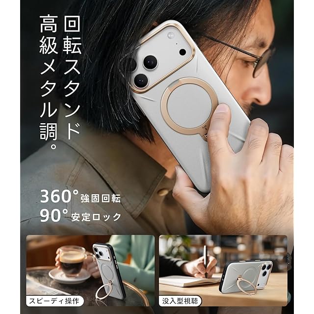 商品名:TORRAS iPhone 17 Pro Max 用 ケース【新感覚レザー・スキンタッチ】Ostand Q3 レザートーン MagSafe対応 リング スタンド 360°定点回転 縦横両対応 マグネット搭載 革 カメラコントロールボタン 米軍規格 耐衝撃 指紋防止 パール・グレー