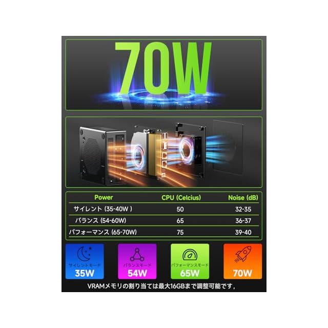 【高性能680m GPU】:Nucbox M7 ミニPCは、「AMD RONA 2」グラフィックスアーキテクチャで作られたAMD Radeon 680M(12Core 2200MHz)グラフィック処理を搭載しています。 性能は完全な GTX 1050 Tiにほぼ近づいています。デュアルファンシステムが装備されているため、迅速に冷却して SSD/DDR をより効率的に実行できます。TDPはBIOSで設定でき、MAX 70W。