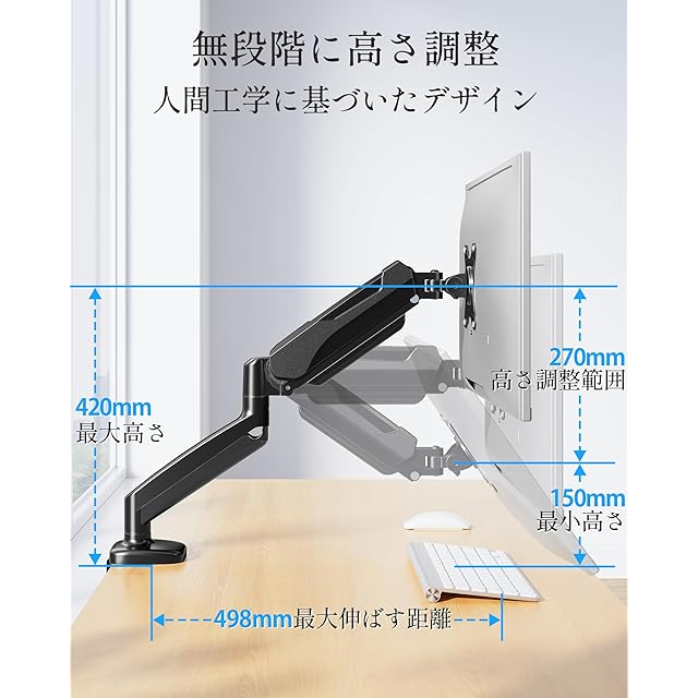 MOUNTUPは高品質のモニターアームを適切な価格でお客様に提供します。 全ての製品は厳しい安全テストに済んており、耐久性に優れています。 日本語の取り扱い説明書も付属されて、初心者でもお手軽に取り付けできます。 当社のモニターアームシリーズは気楽な仕事環境の構築をめざします。 人間工学に基づいたデザインは作業効率を大幅に向上させます。 フルモーションのガス圧式アームは、画面を様々な角度や場所に簡単に移動できます。クランプとグロメット式、二種類の取り付け方法を提供し、様々な机に対応可能です。 製品仕樣: VESA 規格: 75x75mm/100x100mm 耐荷重:2~8kg 対応モニターサイズ:32インチまで 上下の傾き: -45°~+90° スイベル: -180°~+180°。 左右向き: -90°~+90°。 画面回転: 360°
