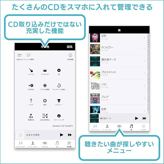【PCなしでスマホにCDを取り込む】本製品に音楽CDをセットしたあとは、スマホで「CDレコミュージック」アプリを入れて、操作するだけでお気に入りの音楽や大好きなアーティストのCDを、かんたんにスマホに入れて持ち歩くことができるスマートフォン用CDレコーダーです。