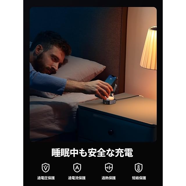 【幅広い互換性】このiPhoneワイヤレス充電ステーションはiPhone17/16/16 Pro/15 Pro Max/14/13/12シリーズ、AirPods Pro 2/1、AirPods3/2およびほとんどのQi対応デバイスと互換性があります。※ご注意:MagSafe対応する保護ケースをつけた場合、充電のパフォーマンスをするために、厚さ3mm以下の保護ケースを使ってください。