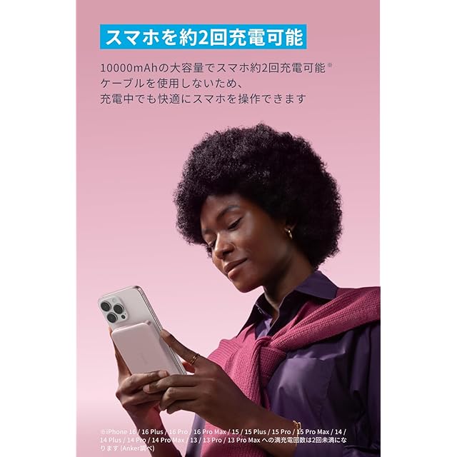 商品名:Anker MagGo Power Bank (10000mAh, Slim) Qi2認証 ワイヤレス充電 最大出力15W MagSafe対応 マグネット式ワイヤレス充電対応 コンパクト 薄型 小型 iPhone 16 / 15 / 14 / 13 / 12 シリーズ 対応 (ピンク)