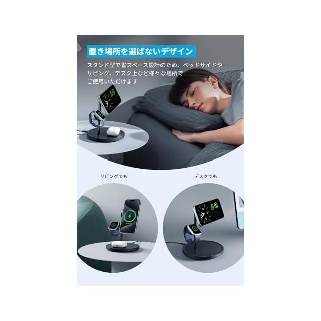 3台まとめてこれ1つ:これ1台で、Qi2対応スマートフォンやワイヤレスイヤホン、Apple Watchの3台を同時に充電可能です。