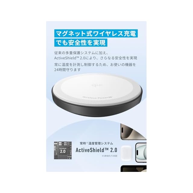 マグネット式ワイヤレス充電でも安全性を実現:従来の多重保護システムに加え、 Active Shield2.0により、さらなる安全性を実現 常に温度を計測し制御するため、お使いの機器を24時間守ります。