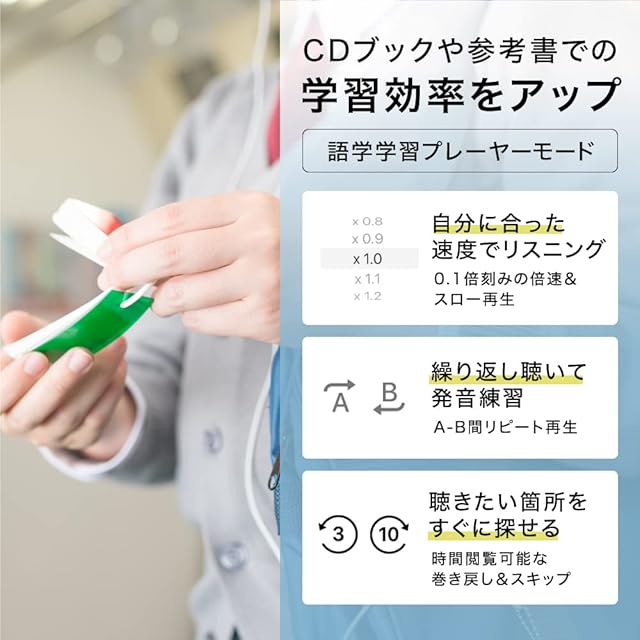 【パソコン不要でCDが取り込める】パソコンを使わずに、スマホやタブレットに直接CD取り込み。楽曲情報の自動取得もでき、CDの楽曲をアプリでかんたんに楽しめる。再生モードを切り替えれば、倍速再生やリピート再生で語学学習にも便利。