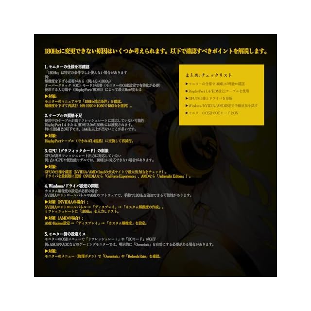 180Hzに変更できない原因はいくつか考えられます。以下で確認すべきポイントを解説します。 1. モニターの仕様を再確認 「180Hz」は特定の条件でしか使えない場合があります。 例: 解像度を下げる必要がある(例: 4K→1080p) オーバークロック(OC)モードが必要(モニターのOSD設定で有効化が必要) 使用する入力端子(DisplayPort/HDMI)によって最大Hzが変わる。 対策: モニターのマニュアルで「180Hz対応条件」を確認。 解像度を下げて再試行(例: 1920×1080で180Hzを選択)。 2. ケーブルの規格不足 使用中のケーブルが高リフレッシュレートに対応していない可能性があるので、 DisplayPort 1.4 または HDMI 2.0が180Hzには推奨されます。 特にHDMI 2.0以下では、144Hz以上が出ないことが多いです。 対策: DisplayPortケーブル(できれば1.4規格)に交換して再試行。 3. GPU(グラフィックカード)の制限 GPUが高リフレッシュレート出力に対応していない。 例: 古いGPUや低性能モデルでは、180Hzに対応できない場合があります。 対策: GPUの仕様を確認(NVIDIA/AMD/Intelの公式サイトで最大出力Hzをチェック)。 ドライバを最新版に更新(NVIDIAなら「GeForce Experience」、AMDなら「Adrenalin Edition」)。 4. Windows/ドライバ設定の問題 カスタム解像度の設定が必要な場合 NVIDIAコントロールパネルやAMDソフトウェアで、手動で180Hzを追加できる可能性があります。 対策(NVIDIAの場合): NVIDIAコントロールパネル → 「ディスプレイ」→ 「カスタム解像度の作成」。 リフレッシュレートに「180Hz」を入力しテスト。 対策(AMDの場合): AMD Radeon設定 → 「ディスプレイ」→ 「カスタム解像度」を設定。 5. モニター側の設定ミス モニターのOSDメニューで「リフレッシュレート」や「OCモード」がOFF 例: ASUSやAOCなどのゲーミングモニターでは、明示的に「Overclock」を有効にする必要がある場合があります。 対策: モニターのメニュー(物理ボタン)で「Overclock」や「Refresh Rate」を確認。 まとめ: チェックリスト ✅ モニターの仕様で180Hzが可能か確認 ✅ DisplayPort 1.4/HDMI 2.1ケーブルを使用 ✅ GPUの仕様とドライバを更新 ✅ Windows/NVIDIA/AMD設定で手動追加を試す ✅ モニターのOSDでOCモードをON