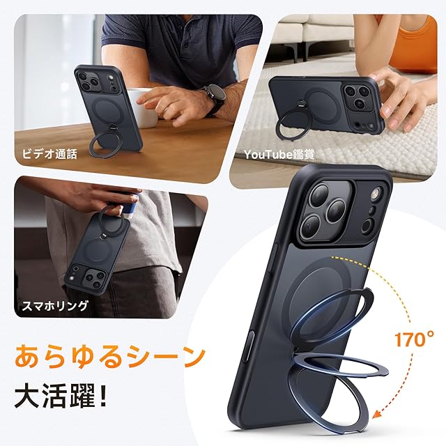 【360°定点回転軸・縦横自由調整】360°定点回転軸を搭載したリング式MagSafe受け兼スタンド。縦横0-170°まで角度調整で動画や通話も快適。市販品の横置き不可を解消し、使いやすさを向上。航空宇宙グレードの高耐久アルミヒンジ採用で耐久性は従来品の4倍、30,000回折り畳み試験もクリア。スマホリングとして片手操作も可能。対応機種:いphone17pro ケース
