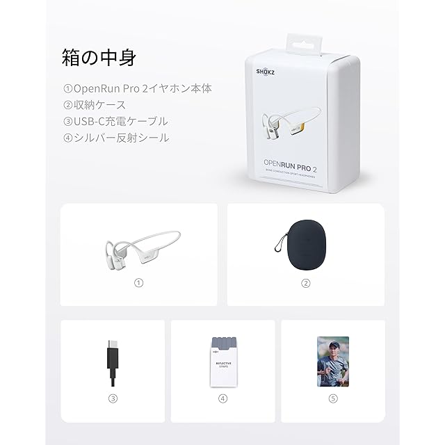 Shokzについて Shokzは、世界的に有名な骨伝導技術を持つオープンイヤーヘッドフォンのリーディングメーカーであり、革新的なデザインと高品質な音響体験を通じて新しいライフスタイルを提案し続けています。 使用シーン Shokzのワイヤレスヘッドフォンは、ウォーキング、通勤、学習、仕事、リモートワーク、会議、スポーツ、ランニング、サイクリング、ヨガ、テニス、ハンズフリー通話、テレコミューティング、ウェブ会議、モバイルゲーム、通勤、リモートワークなど、さまざまなシーンで輝きます。誕生日、新年、クリスマスギフトに最適です。 製品仕様 材料:シリコン、プラスチック、ニッケルチタン合金 Bluetoothバージョン:Bluetooth 5.3 充電時間:60分 1回の充電での使用時間:最大12時間のバッテリー寿命 充電方法:USB Type-C 同梱物 OpenRun Pro 2イヤホン本体*1、収納ケース*1、USB-C充電ケーブル *1、シルバー反射シール *1、書*1、ユーザガイド*1