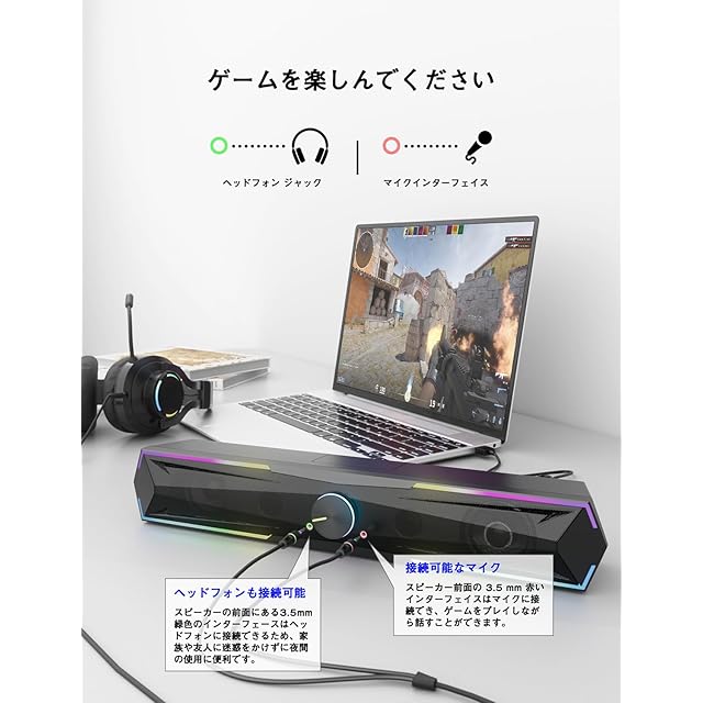 商品名:Kstime【最新Bluetooth5.4 & USBダイレクト】PCスピーカー サウンドバー 10W RGB ゲーミングスピーカー 六つのスピーカーユニット 二重対称インバーターチューブ ステレオ 大音量&豊かな低音 ラップトップ、タブレット、スマートフォンに対応、USB給電式のパソコンスピーカー