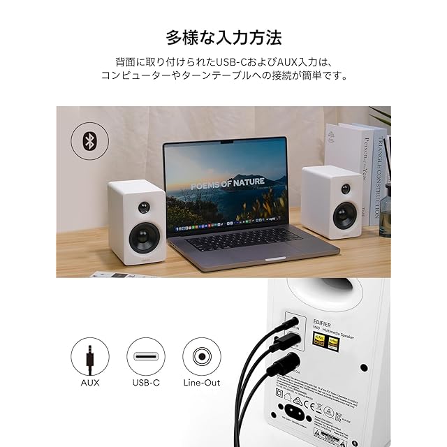 【多様な入力方法】背面に取り付けられたUSB-CおよびAUX入力は、コンピューターやターンテーブルへの接続が簡単です。