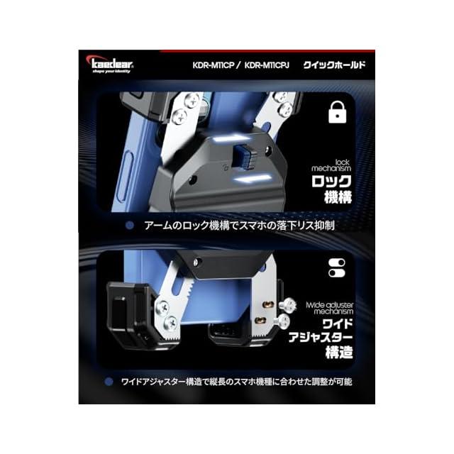 【KDR-M11Cで頂いたお客様の声を製品にアップデート】 ⑴カメラの出っ張りを回避する形状に変更。 ⑵内部のギアの外形を大きくして開閉限界回数を向上。 ⑶ワイドアジャスターで縦長のスマホに対応。 ⑷厚さ12mmから15mmに変更し、スマホへのアームの掛かりが深い形状に変更。 ⑸アームのロック機構の追加。