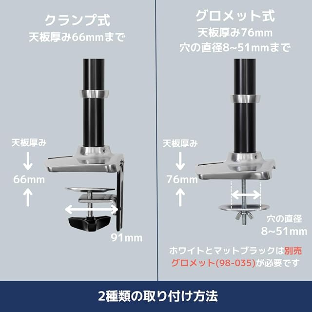 クランプは66mmまでの厚さ、グロメットは直径8~50mmの穴、76mmまでの厚さに取り付け可能です。