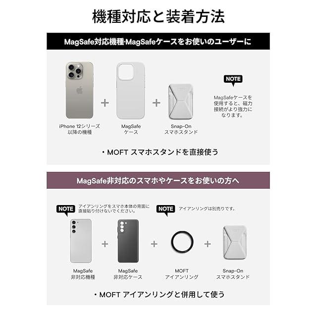 【アイアンリングと併用可能・全機種対応】iPhone 17 Pro Max/iPhone 17 Pro/iPhone Air/iPhone 17/iPhone 16 Pro Max/iPhone 16 Pro/iPhone 16 Plus/iPhone 16/iPhone 15 Pro Max/iPhone 15 Pro/iPhone 15 Plus/iPhone 15/iPhone 14 Pro Max/ iPhone 14 Pro/iPhone 14 Plus/iPhone 14/iPhone 13 Pro Max/iPhone 13 Pro/iPhone 13/iPhone 13 Mini/iPhone 12 Pro Max/iPhone 12 Pro/iPhone 12/iPhone 12 Mini 全シリーズに対応できます。背面にマグネットが付いていないスマートフォンも、アイアンリング(別売り)をスマートフォンケースに取り付けるだけで使用できます。 取り付け方法については、詳細ページをご参照ください。【注意:粘着面がある側はスマホケースまたはスマホの背面に貼り付けてください。スタンドには貼り付けないでください。】