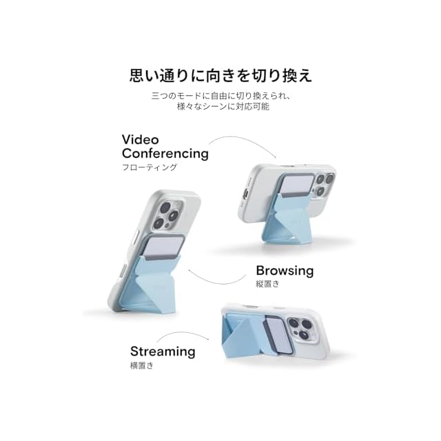 【三つの使用モード・自由に切り換え】マグネット内蔵で、MagSafe対応機種(iPhone17/16/15/14/13/12シリーズ)にお使いいただけます。縦置き、横置き、フローティングモードに自由に切り換えられ、様々なシーンに対応可能です。