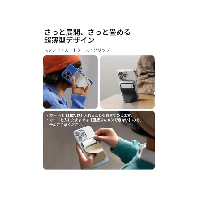 【カード1~2枚収納・身軽に外出】スリムなデザインでありながら、クレジットカードや運転免許証などをすっきり収納可能です。スタンドを展開してすぐに取り出せ、畳めるとカードのようにスマホに付け、場所をとりません。