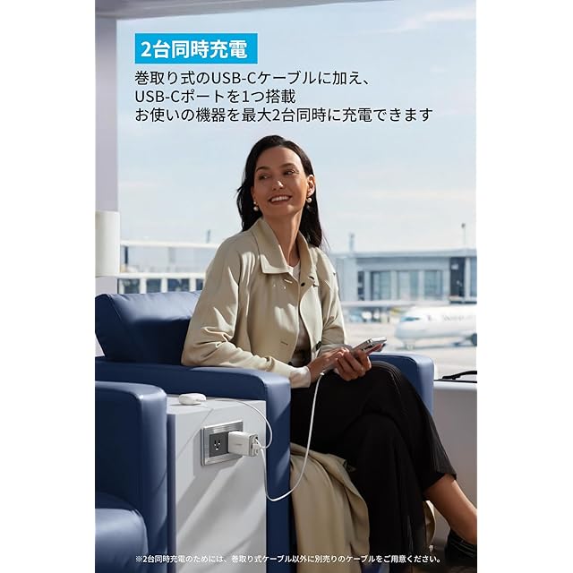 2台同時充電:内蔵された巻取り式のUSB-Cケーブルに加え、USB-Cポートを1つ搭載。お使いの機器を最大2台同時に充電できます。