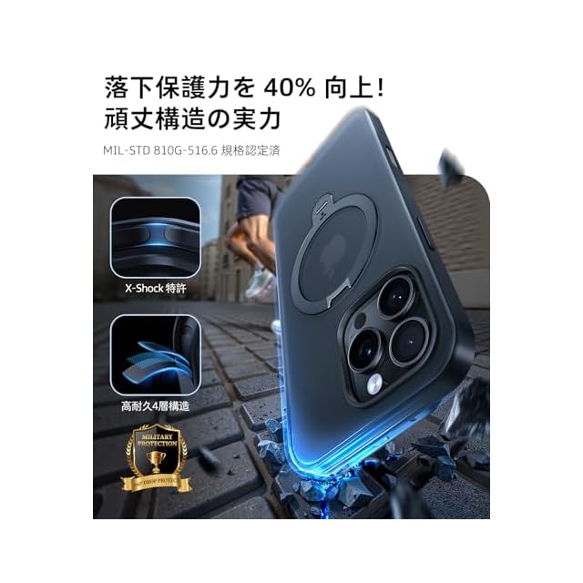 【米軍耐衝撃・高額な修理代を心配なし】Ostand Q3 Spin は 2025 年最新型の 3 層構造ショックアブソーバーを搭載し、航空級アルミニウムフレームスタンドと耐摩耗 PC を組み合わせた軍規級保護ケース。日常では電車の混雑で落としたり、登山中に岩石にぶつけたりしても端末を傷から守る。米軍規格 MIL-STD-810H をクリア(認証番号:GZMR220300651)し、端末コーナーに 0.5mm 段差設計を施して画面とカメラを保護し、3m 高さから 100 回落下しても亀裂を生じにくい。薄型デザインが iPhone のデザインを損なわず、グリップ性のある表面処理で滑落リスクを軽減。