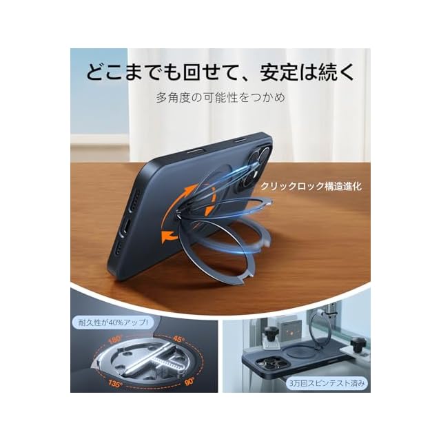 【縦横両安定対応・家族みんなが手放せない】Ostand Q3 Spin は使い始めたら手放せない!金属ギアの「カチッ」音で角度がしっかりロックされ、横にしても縦にしても安定だ。自宅でご飯を食べながら横向きに少し傾ければ、野球中継やアニメも画面で見逃さず;通勤中は指輪で手に固定し、急ブレーキでも落ちない。キッチンでは縦向き 90° に直立させればレシピもはっきり見える。年配の方は卓上に横向きに置いて手が疲れず、「カチッ」で簡単調節;子供は指輪で横向きに持っても落ちないので安心。5000 回以上の開閉に耐え、キズや指紋に強い —— 横も縦も自在に使えるこんな安定感のあるケースを拒む人はいない。