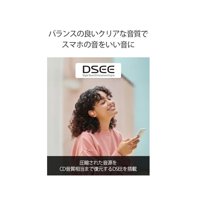 高音質かつ自分好みに調整可能 高音域から低音域までバランスが良好で、かつボーカルが自然で明瞭 DSEEで圧縮された音源をCD音質相当まで補完し、自分好みの音質に調整も可能
