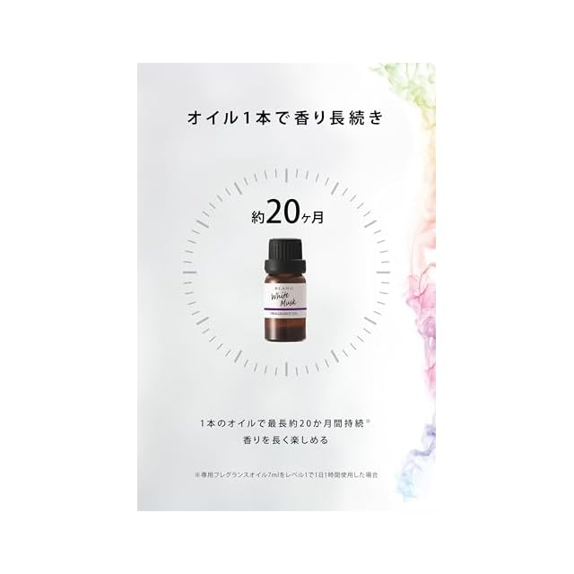 【香りの交換も簡単】ボトルを交換するだけで、簡単に香りをチェンジできるので、気分やシーンに合わせて香りを選べます。専用ボトルの香りは、ホワイトムスクをはじめ、多彩にラインナップしています。すべてのモードで2時間オートオフ機能を搭載しているため、消し忘れの心配がありません。